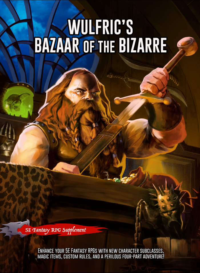 Wulfric's Bazaar of the Bizarre features 12 new character subclasses, 55 magic items, 8 custom game rules, and a 4-part mini-campaign designed for PC levels 1-5.